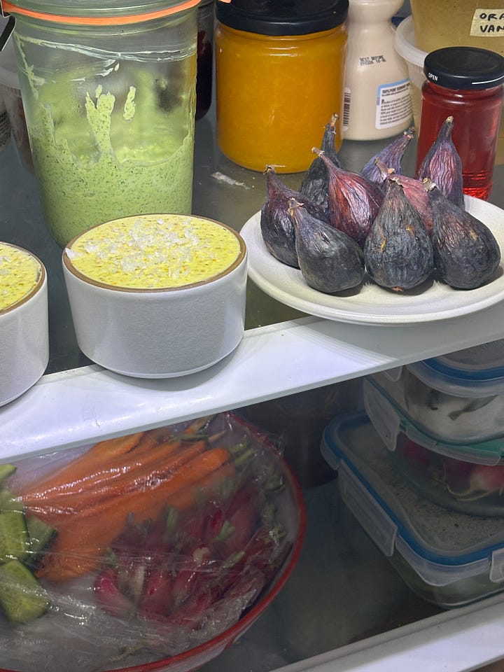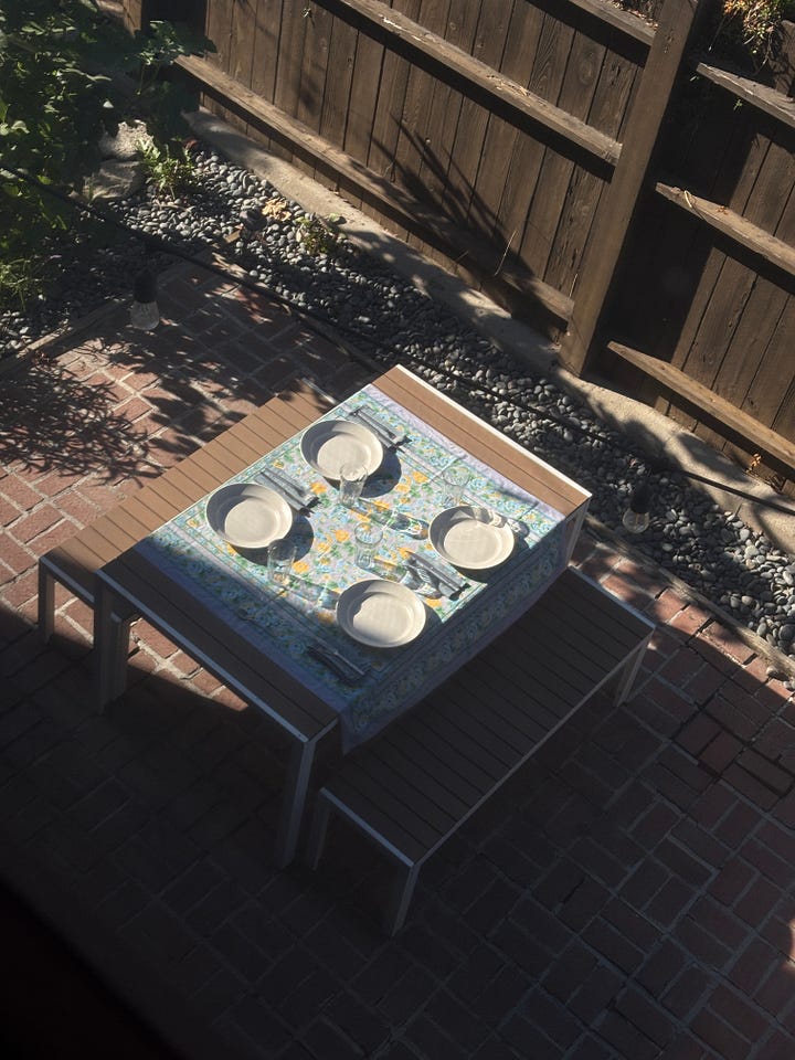 Had a little dinner party and I liked the photo of my (sparse) backyard ready for people. I love figs on a plate but I only ended up eating half of them. I have a hard time with figs even though they’re arguably the chicest fruit. Made some roasted tomato compound butter, green goddess dip with crudité, bread, nice sausages, and the aforementioned apricot almond cake. A nice weekday dinner menu.
